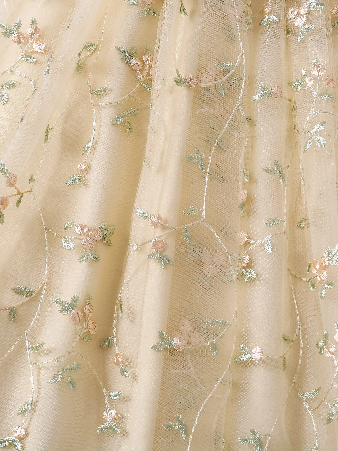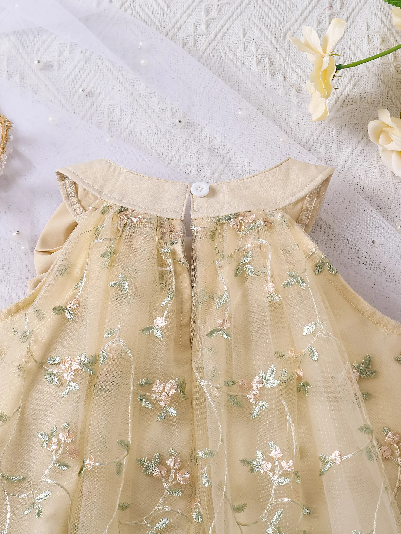 A summer fashionable girl dress with small floral embroidery, net gauze and bow decoration, and a cute princess dress